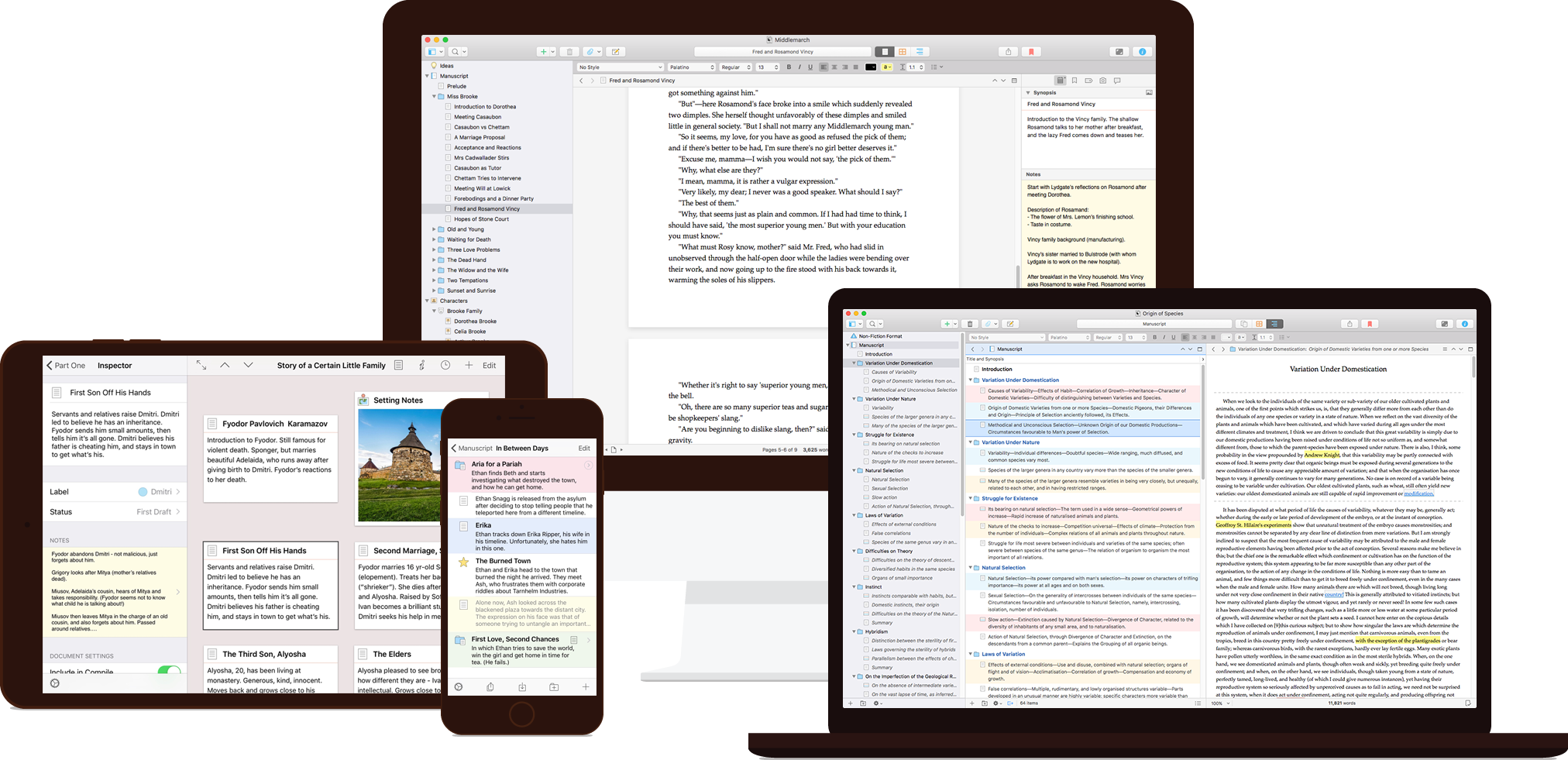 Tailor-made for creating long manuscripts, Scrivener lets you break up your writing into sections as small or large as you like. At its heart is a simple ring-binder metaphor—gather material and switch between writing, notes and research with ease. Got a great idea but don’t know where it fits? Compose your text in any order you want—write when inspiration strikes and find its place later.